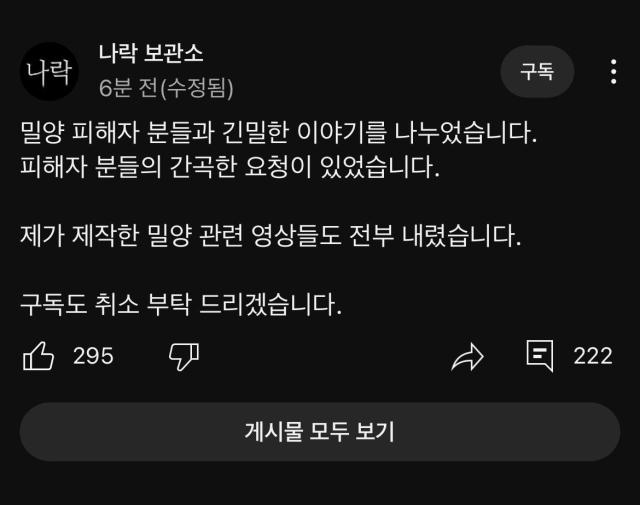 나락보관소 측에서 자신이 밀양 사건을 긴 시간 동안 조사했다고 말하면서 영상을 올렸는데요.